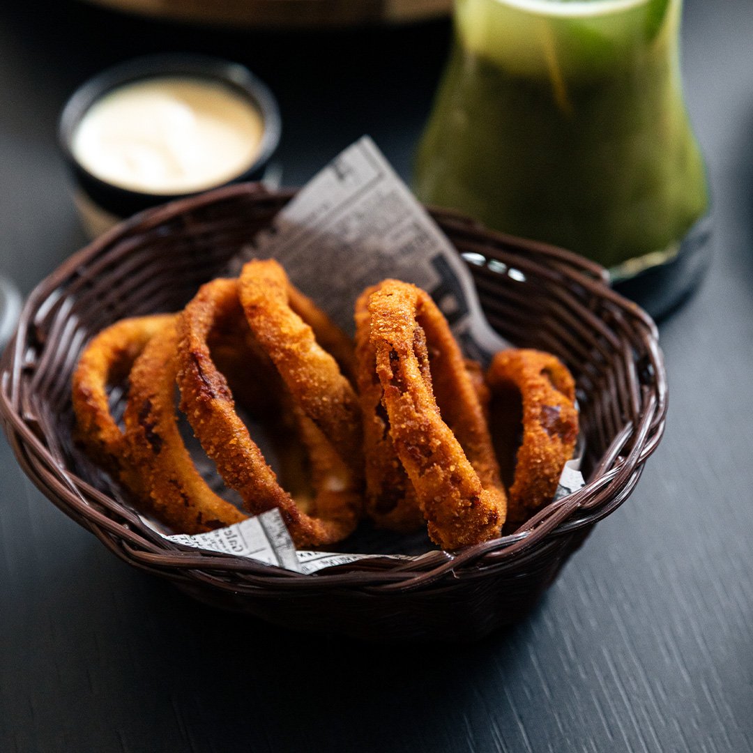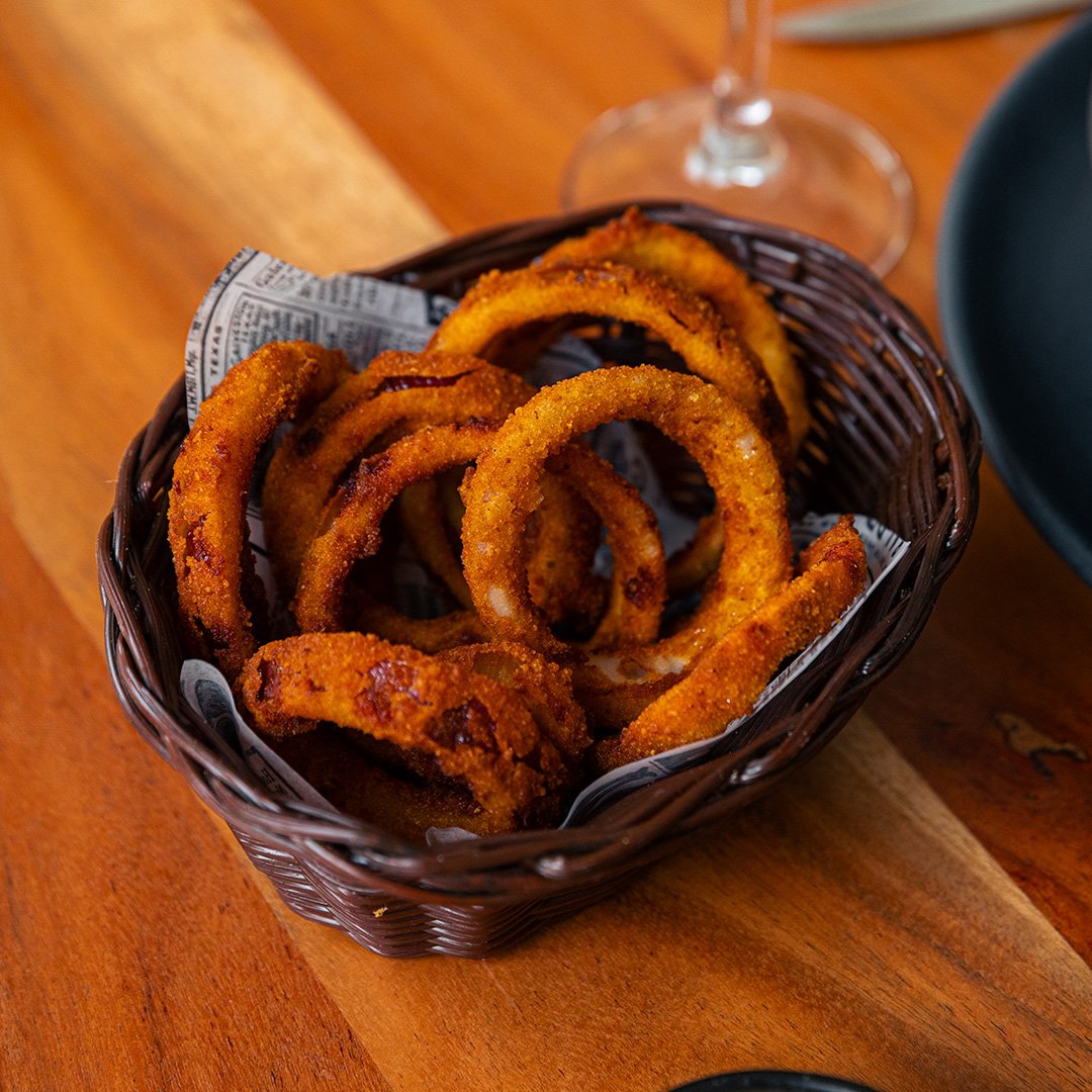 Onion bread, breaded mushroom strips, avocado spread, vegan cheese, caramelized onion, and arugula, served with sweet potato fries (vegan)
